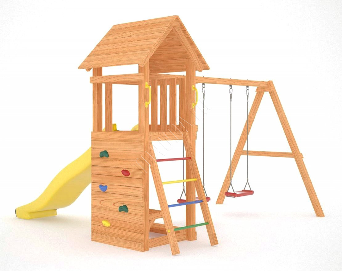Основной материал натуральный и экологичный – это шлифованный клееный брус, края которого скруглены. Занозы и ссадины исключены. Детская площадка безопасна: конструкция рамы произведена согласно ГОСТ, все крепежи закрыты заглушками, а подвесное снаряжение сертифицировано и создано в Бельгии специально для детей.