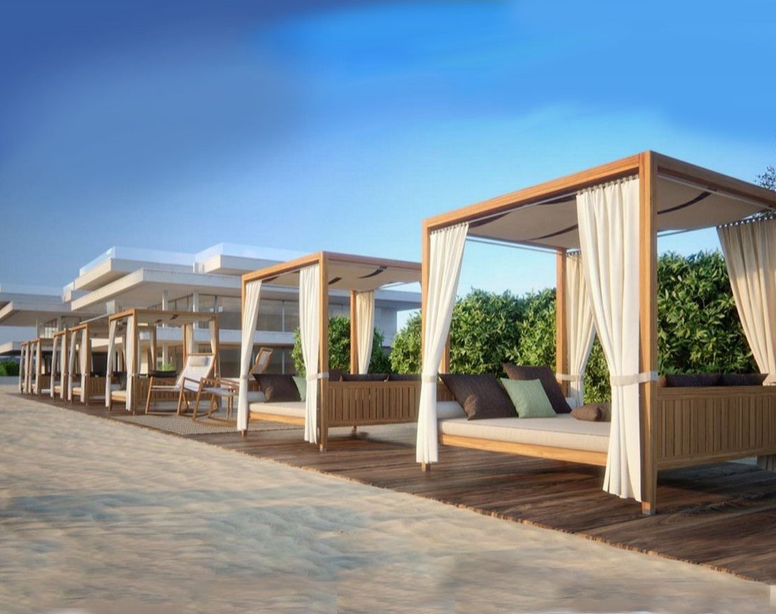 Полная комплектация: теневые занавесы из хлопка, 7 шт. подушек и 2 матраса.